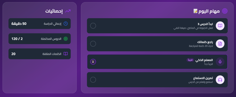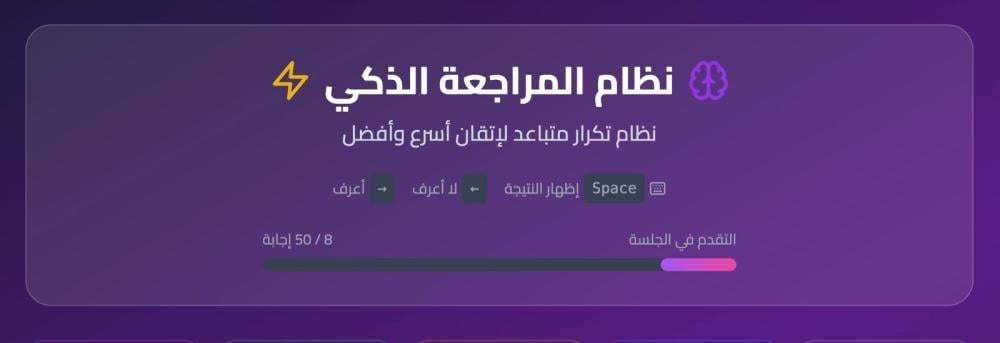- التعلم باللعب (Gamification): 50 بطاقة تفاعلية يومياً تراجع فيها معلوماتك بمتعة وبدون ملل الكتب التقليدية.