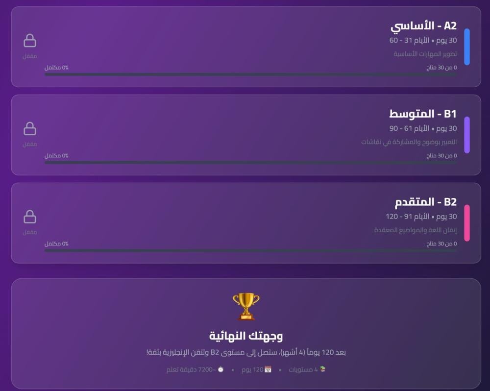 المنهج مقسم لـ 120 يوماً تغطي 4 مستويات. الجميل؟ المنصة مفتوحة 24 ساعة، تقدر تخلص درس واحد، أو تنهي أسبوع كامل في جلسة واحدة.. أنت القائد!